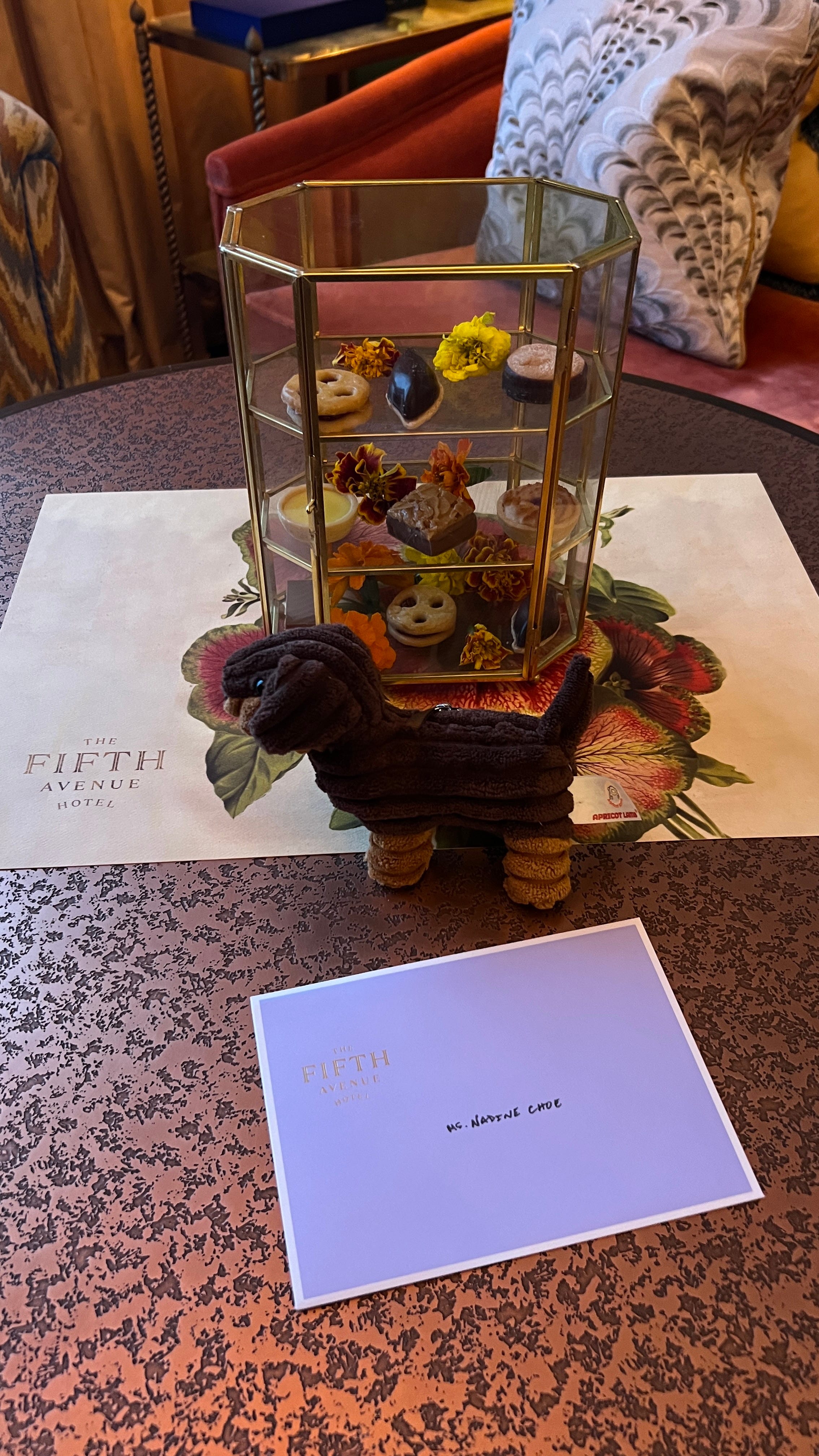 Upon arrival at the Fifth Avenue Hotel, as my butler, Angel, was pouring me a welcome drink and talking me through the iPad room controls, I noticed a stuffed brown dachshund keychain on the coffee table, along with a welcome note and a case of mini pastries. If you know me IRL, you’ll know about my brown dachshund named Miuccia, who is my sidekick and comes with me almost everywhere in Milan. It was a perfect coincidence that I had spent the car ride from the airport to the hotel looking at pictures of her because I was missing her!